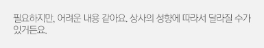 KH에서 특강을 할 때 커뮤니케이션을 많이 했으면 좋겠다고 이야기 했 어요. 사실 신입사원들은 어려운 이야기를 잘 못해요. 점심이나 회식자리 에서 윗사람이 힘든 점을 물어보면 괜찮다고만 하는데, 한 번쯤은 힘든 점이나 문제제기를 해주는 것도 좋아요. 개인적인 생각이라서 틀릴 수는 있지만, 신입은 실수가 어느 정도 용납이 되니까 하고 싶은 이야기를 해 줬으면 좋겠어요. 그런 것을 들어줘야 발전하는 조직이 된다고 생각해요.