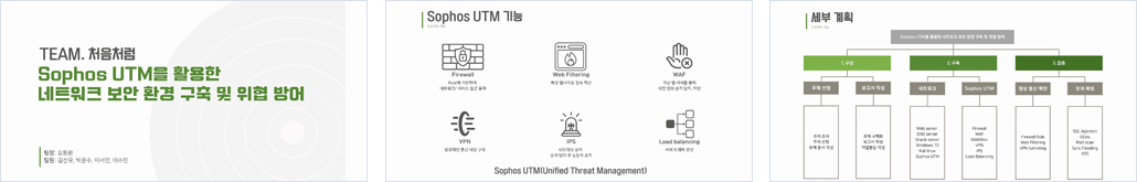 개요 최근 들어 원격근무의 일상화와 더불어, 사이버 위협이 갈수록 다양화됨에 따라 기업의 업무망을 보다 정밀하게 보호할 수 있는 네트워크 보안 체계의 필요성이 강조되고 있다. 본 프로젝트는 Sophos UTM이 제공하는 다양한 보안 기능 WAF(Web Application Firewall), ACL(Access Control List), IPS(Intrusion Prevention System), 웹 필터링(Web Filtering), VPN(Virtual Private Network)을 종합적으로 사용하여, 외부로부터의 비인가 접근을 효과적으로 차단하고 내부 자산에 대한 침해를 방지할 수 있는 종합 보안환경 구축을 목표로 한다.