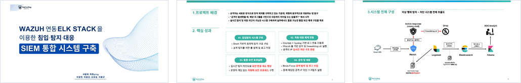 :SIEM 서버를 중심으로 서버 및 보안 장비의 보안 로그를 수집·통합·시각화할 수 있게 Kibana 대시보드를 통해 침입 시도, 로그인 실패, 시스템 경고 등의 이벤트를 실시간으로 모니터링이 가능하게 한다.