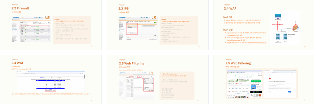 개요 최근 들어 원격근무의 일상화와 더불어, 사이버 위협이 갈수록 다양화됨에 따라 기업의 업무망을 보다 정밀하게 보호할 수 있는 네트워크 보안 체계의 필요성이 강조되고 있다. 본 프로젝트는 Sophos UTM이 제공하는 다양한 보안 기능 WAF(Web Application Firewall), ACL(Access Control List), IPS(Intrusion Prevention System), 웹 필터링(Web Filtering), VPN(Virtual Private Network)을 종합적으로 사용하여, 외부로부터의 비인가 접근을 효과적으로 차단하고 내부 자산에 대한 침해를 방지할 수 있는 종합 보안환경 구축을 목표로 한다.