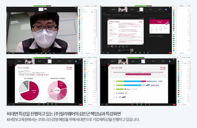 앞서 기업 소개와 가상화 엔지니어로서의 비전에 대해 김민곤 수석님께서 말씀해 주셨는데요. 뒤이어 가상화 엔지니어 교육 및 채용에 대해 박진희 차장님께서 설명해 주셨습니다. 참여한 KH정보교육원 훈련생의 반응을 보니, 비대면으로도 숨길 수 없는 뜨거운 열정이 질문 속에 고스란히 담겨있었습니다.